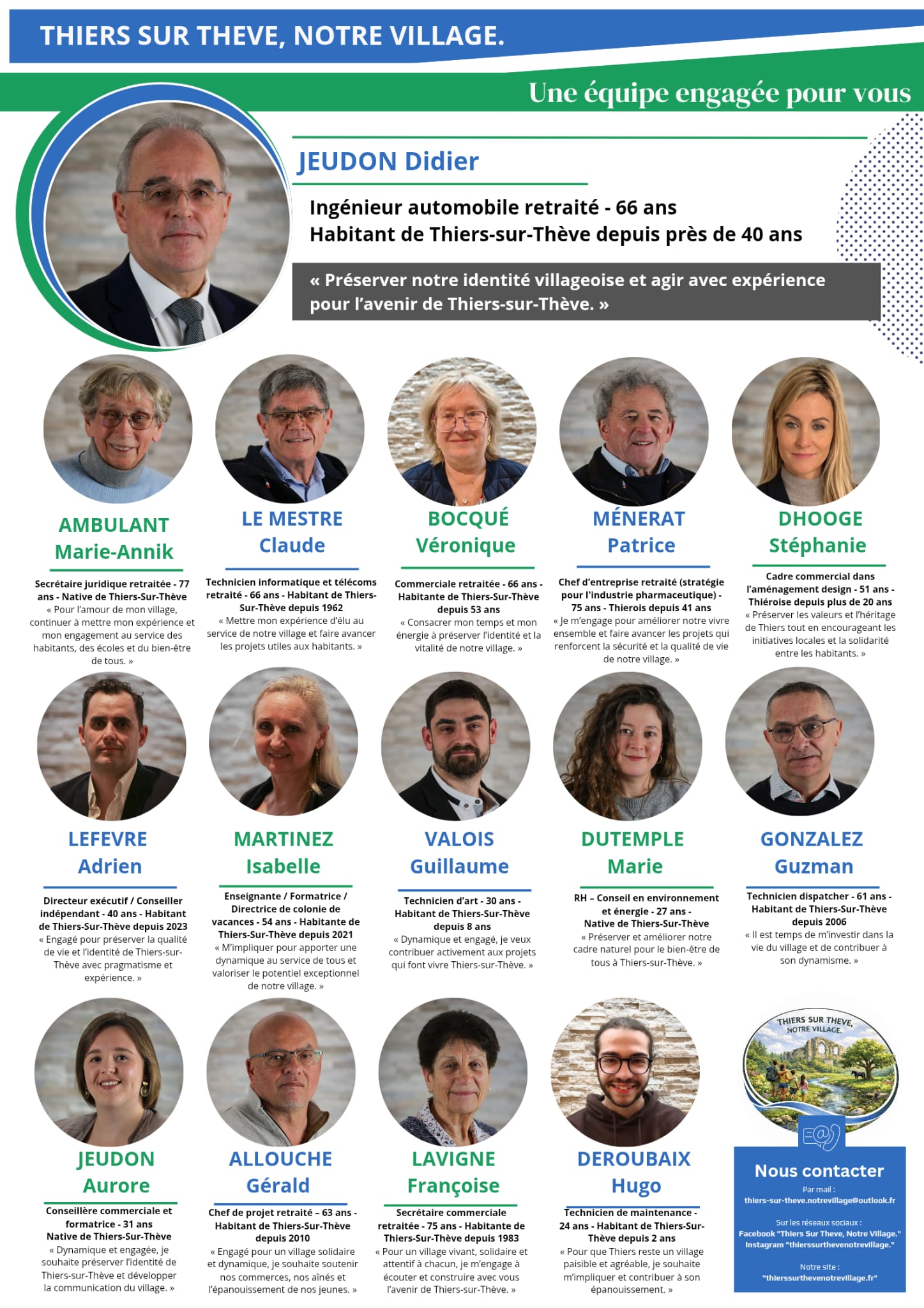 Je suis certain que la municipalité est le cadre idéal pour développer des projets de vie qui renforceront nos liens. En tant que jeune résident, je souhaite m’impliquer dans la vie de notre village et contribuer à son épanouissement. C’est pourquoi je souhaite m’investir sur la liste « THIERS SUR THEVE, NOTRE VILLAGE. » pour les prochaines élections municipales de 2026.
